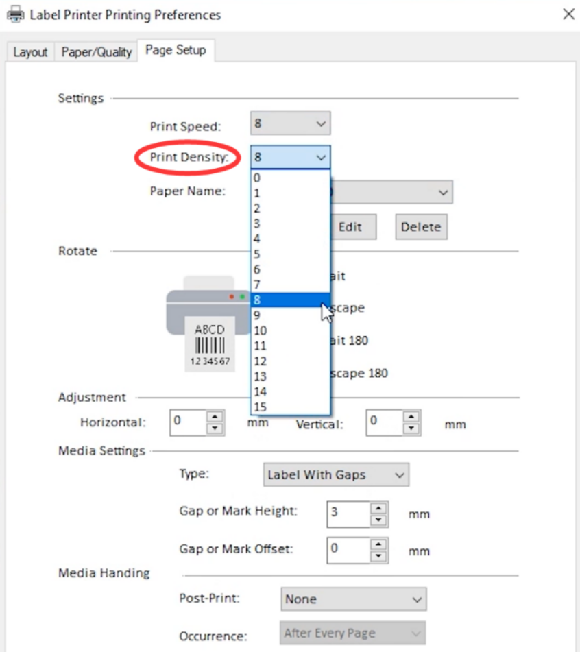 The exact number for darkness and print speed depends on the type of label you are using. We recommend starting with 4 and 4. If your print is too light, please increase the darkness setting number to get a darker print.