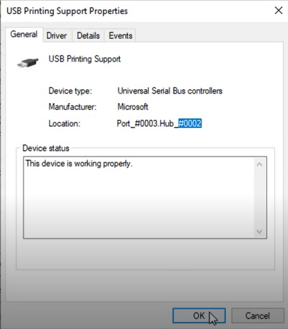 (2) "Device Manager" -> "Universal Serial Bus controllers" -> Double click on "USB Printing Support" to check which USB port is connected